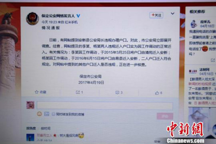 据中新网报道,4月19日晚,保定公安网络发言人19日晚间发布消息称,日前,有网帖提到安新县公安局长违规办理户口。对此,保定市公安局立即展开调查。经查,网帖提及的李某、杨某两人违规迁入户口实为因工作调动的正常迁入。李某因工作调动,于2015年3月25日将户口由清苑迁入安新;杨某因工作调动,于2016年6月15日将户口由易县迁入安新,二人户口迁入符合规定。对网帖中提到的其他户口迁入是否违规,正在进一步核查。