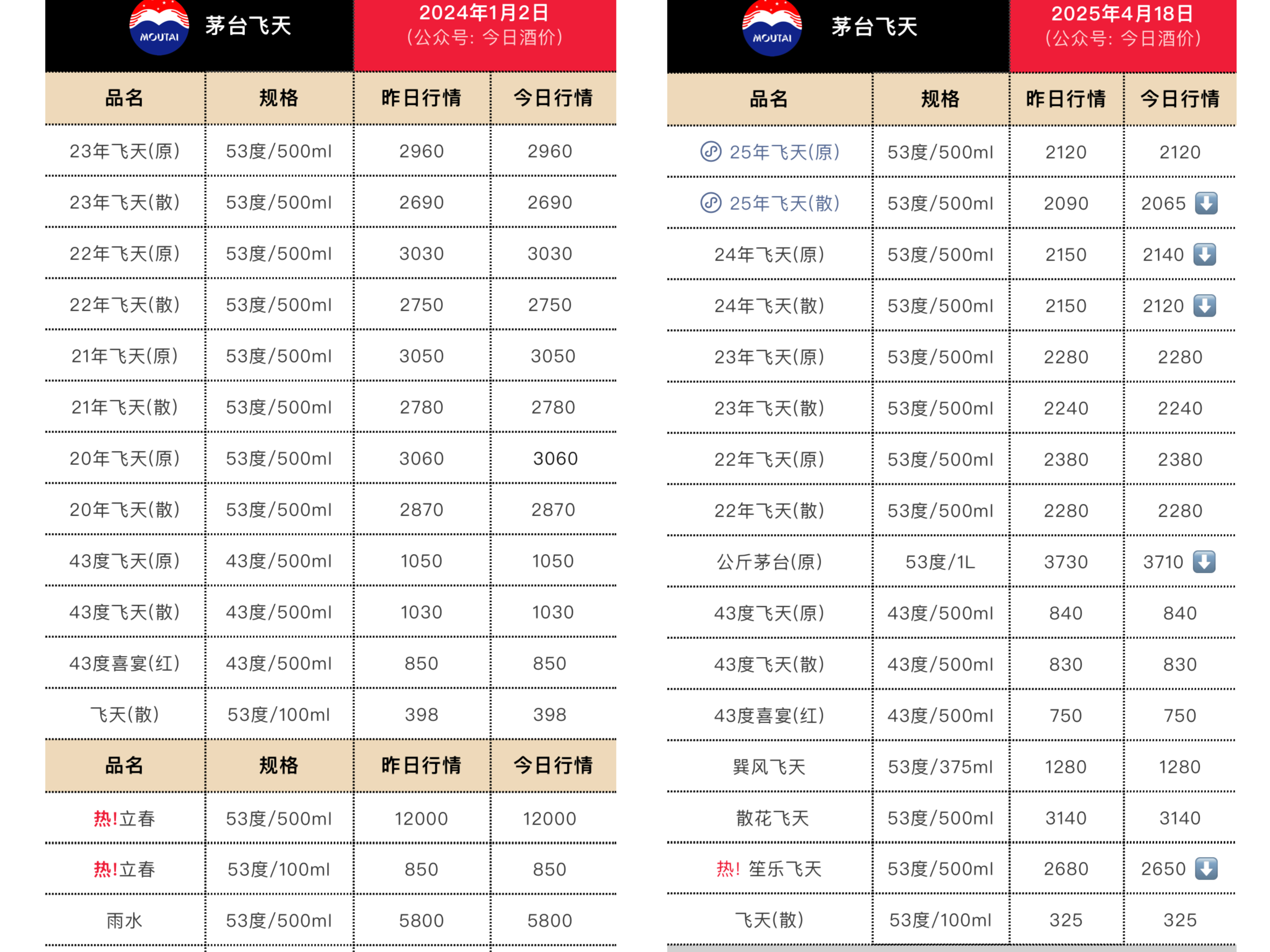 2024年以来,白酒行业整体承压已成为行业共识。茅台虽为行业龙头,亦难以独善其身。最新数据显示,自年初至今,飞天茅台的终端价格已从近3000元/瓶跌至2100元左右,价格下探幅度超过30%。