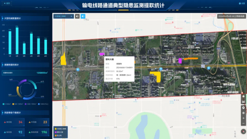 输电走廊通道典型隐患监测预警:基于高分辨率卫星遥感影像对输电线路两侧各缓冲区范围内隐患进行监测,并形成监测报告和监测成果服务推送,实现目标区大棚、地膜、防尘网、厂房、彩钢瓦、林地、裸土等潜在隐患的全局掌握,辅助公司进行电力通道潜在隐患管控与治理,为电力通道的安全维护提供重要的决策支持,提升其生产运行能力和集约精细化管理水平,保障电力通道的安全稳定运行。