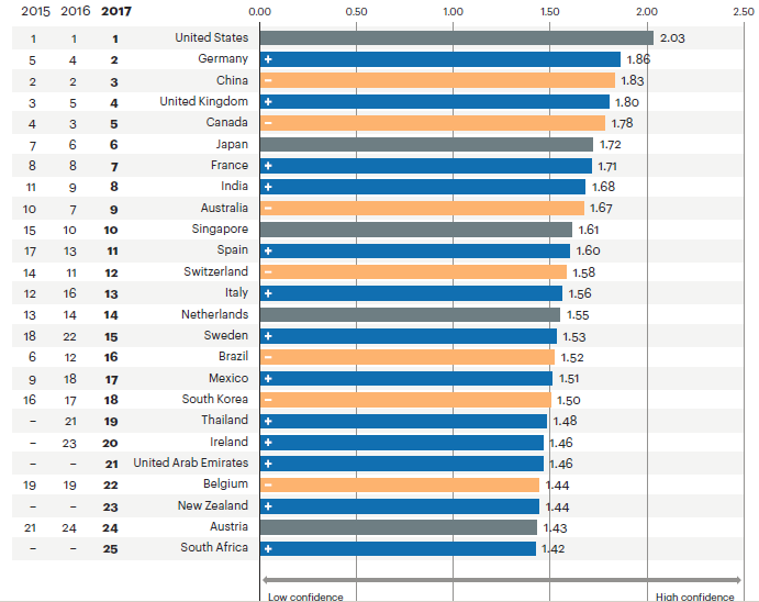 鉴于英国“脱欧”引发的对其经济增长和投资吸引力将下降的担忧,英国的排名表现不俗。尽管这些负面影响并没有在2016年转化为现实,但投资者称,他们越来越对英国中期的经济前景感到悲观。
