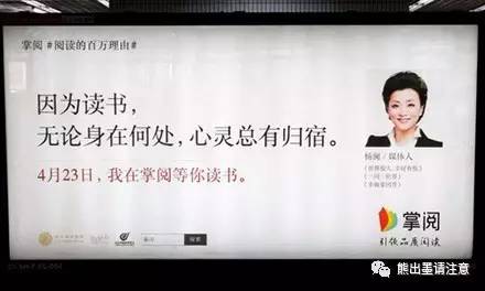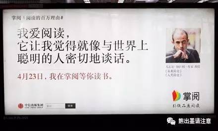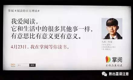 前几天,在地铁车厢里,楚楚发现两个青年指着掌阅系列中作家大冰那张,谈论着看过他的书,并把他的那句十分绕口的话念了一遍。很快,车开走了,他们换了话题,但品牌应该是在他们心中植入了一次。