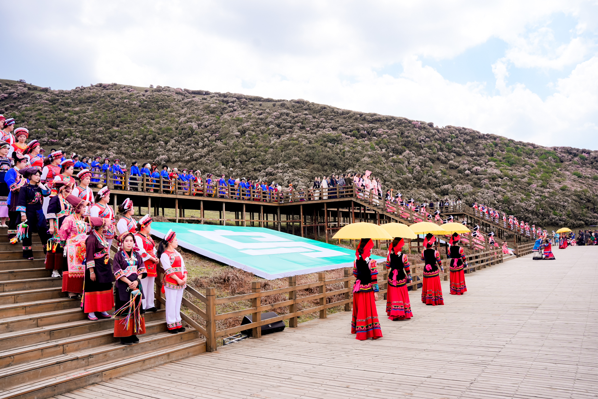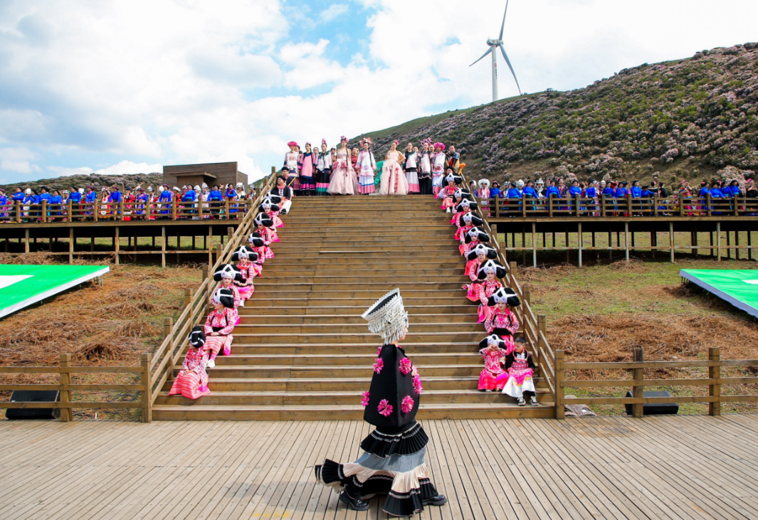 2025年4月20日,贵州乌蒙大草原以四万亩野生高山杜鹃为幕布,上演一场名为“乌蒙村秀”的民族时尚发布。以花卉为灵感载体,以服饰为文化介质,彝族、苗族、白族、布依族、侗族五大民族传统服饰系统完成非遗传袭与现代设计的对话。天然木栈道T台、多维度助农直播与自然景观共同构建出民族文化与生态旅游的共生叙事。