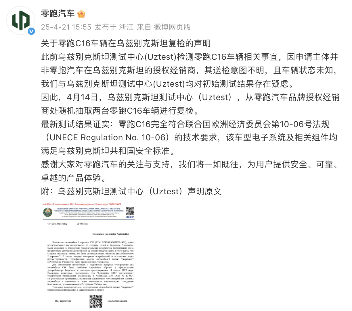 4月21日,@零跑汽车 发布关于零跑C16车辆在乌兹别克斯坦复检的声明: