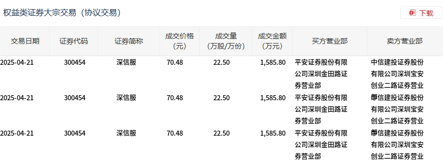 4月21日,深信服大宗交易成交67.5万股,成交额4757.4万元,占当日总成交额的7.5%,成交价70.48元,较市场收盘价90.15元折价21.82%。