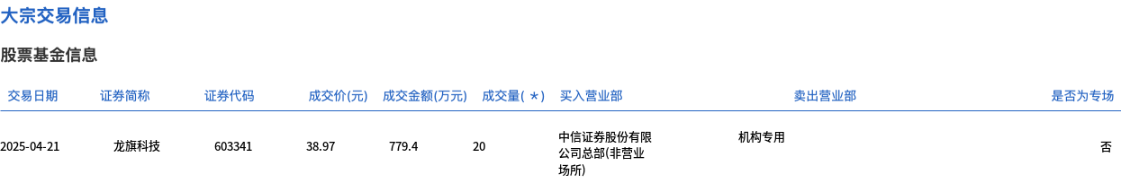 4月21日,龙旗科技大宗交易成交20万股,成交额779.4万元,占当日总成交额的6.02%,成交价38.97元,较市场收盘价39.36元折价0.99%。