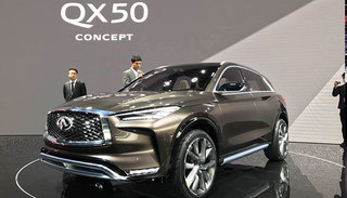 车身侧面QX50概念车同样保留了此前QX Sport Inspiration概念车的线条,内凹式的腰线搭配线条刚硬的轮眉、逐渐下滑的车顶线条走势,以及新月式D柱镀铬饰条,营造出了紧实而颇具动感的流畅设计。