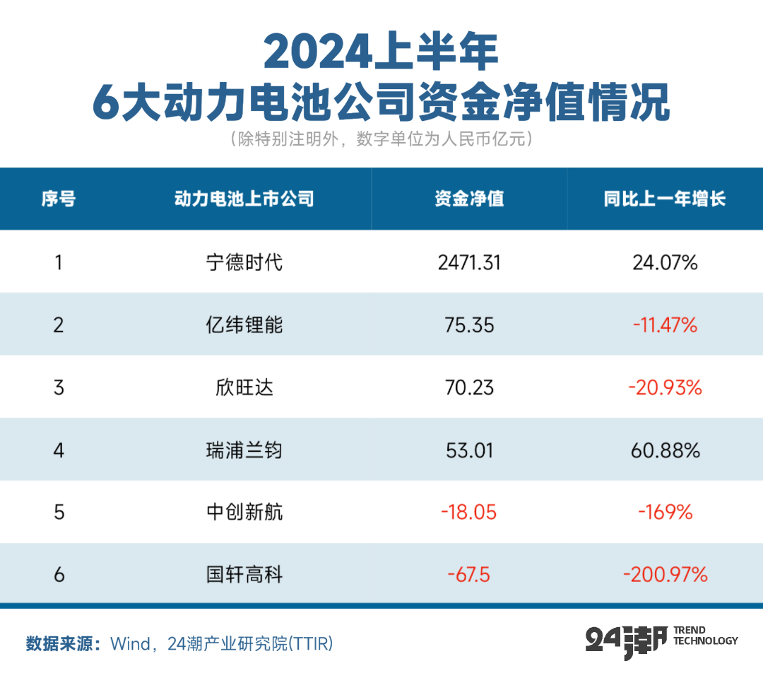 此外,24潮产业研究院(TTIR)统计显示,资本也在向寡头加速聚集。2024年上半年宁德时代、亿纬锂能、欣旺达、瑞浦兰钧、中创新航和国轩高科资金净值(资金储备-短期有息债务)合计为2584.35亿元,其中仅宁德时代资金净值就高达2471.31亿元,占比达95.63%。(注部分企业尚未披露2024年年报,为保持数据客观公正,所以统一采用2024年半年报数据)