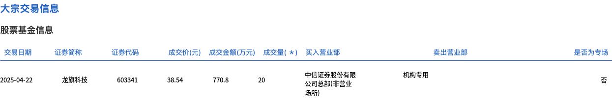 4月22日,龙旗科技大宗交易成交20万股,成交额770.8万元,占当日总成交额的7.25%,成交价38.54元,较市场收盘价38.93元折价1%。