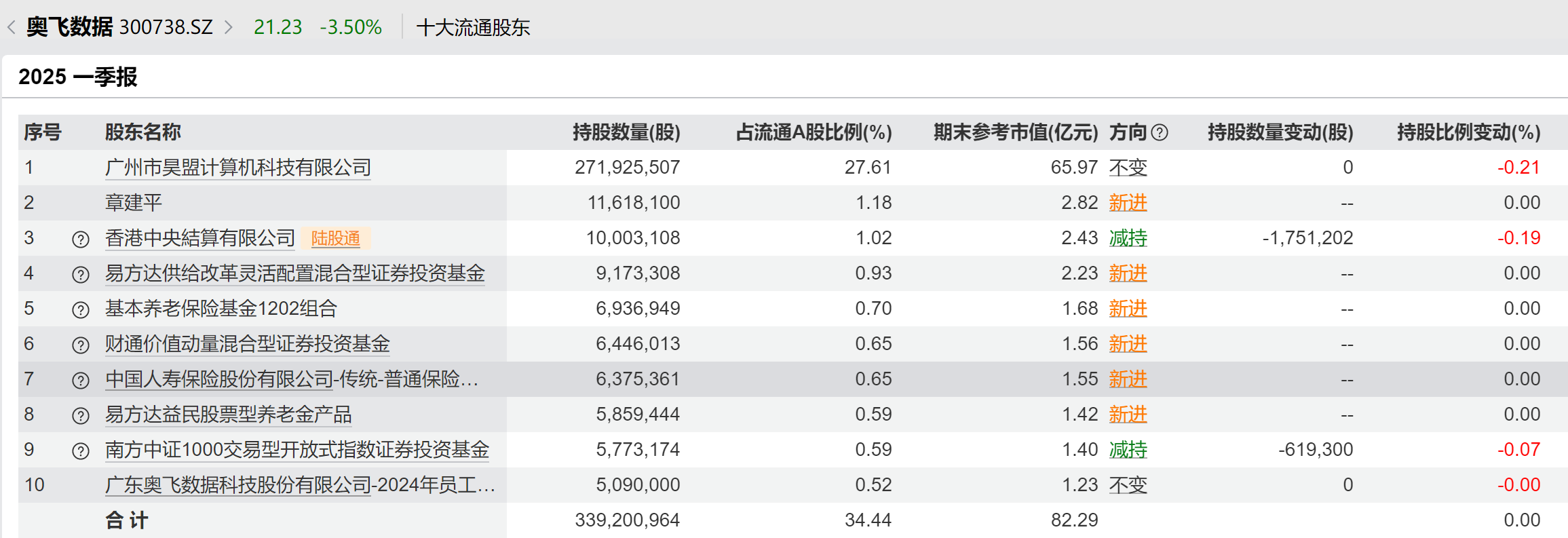此外,今年一季度章建平还新进出现在奥飞数据(300738.SZ)前十大流通股东中,持股数量为1161.81万股,期末参考市值为2.82亿元。