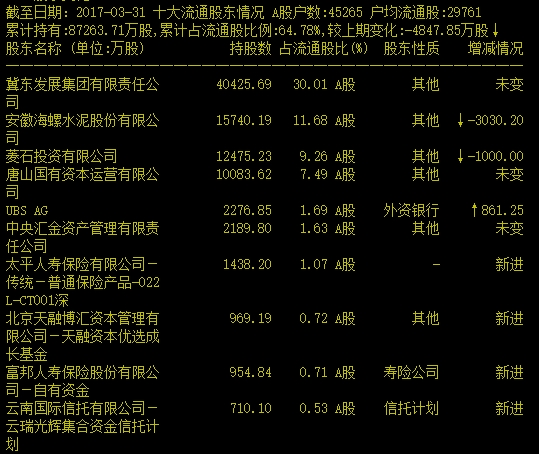 4月20日晚间冀东水泥也披露了2017年一季报,前十大流通股东中与2016年年报相比,新增的有太平人寿保险有限公司-传统-普通保险产品-022L-CT001深;北京天融博汇资本管理有限公司-天融资本优选成长基金;富邦人寿保险股份有限公司-自有资金;云南国际信托有限公司-云瑞光辉集合资金信托计划。
