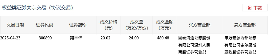4月23日,翔丰华大宗交易成交24万股,成交额480.48万元,占当日总成交额的5.3%,成交价20.02元,较市场收盘价25.49元折价21.46%。