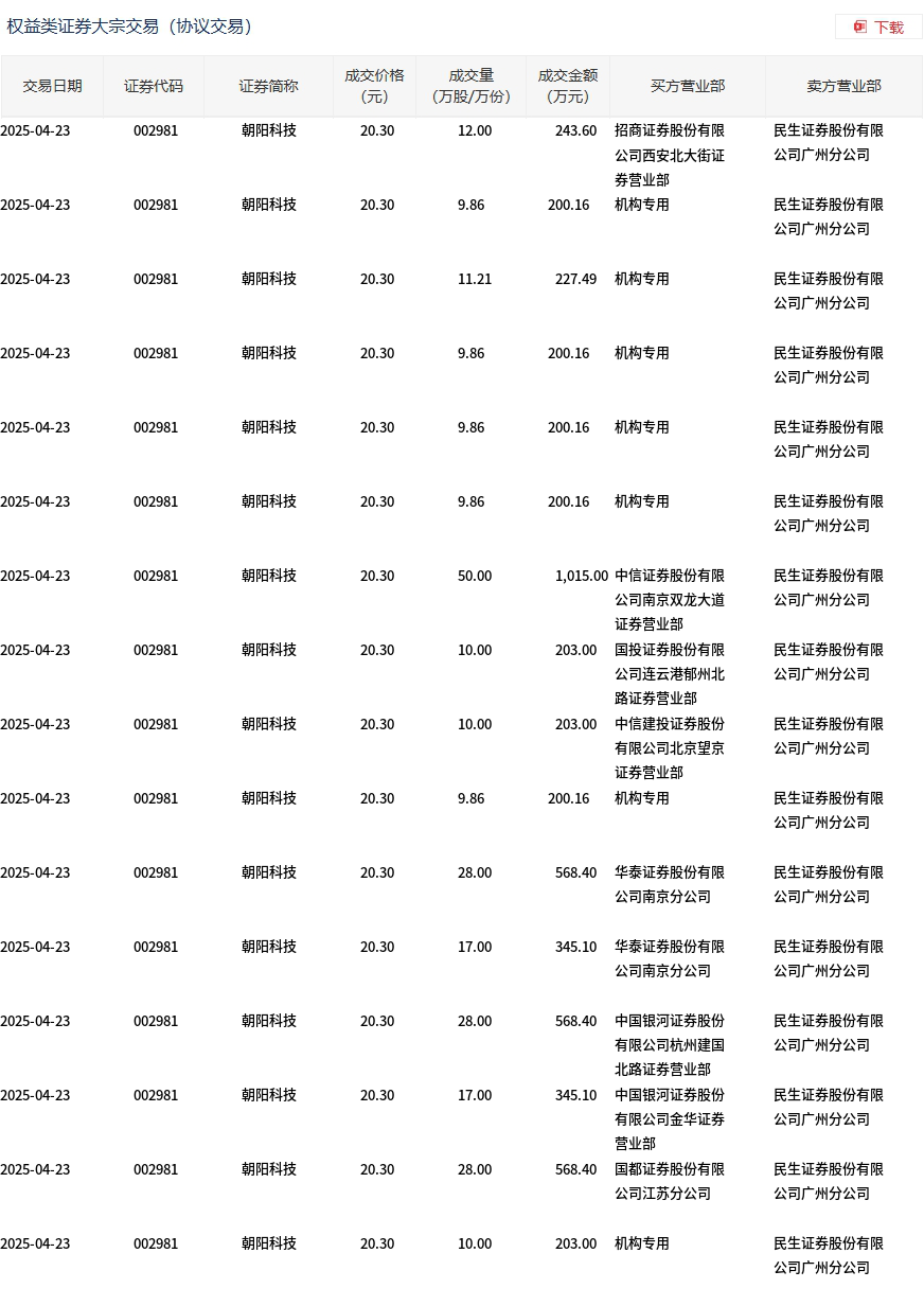 4月23日,朝阳科技大宗交易成交270.51万股,成交额5491.29万元,占当日总成交额的34.55%,成交价20.3元,较市场收盘价23.6元折价13.98%。