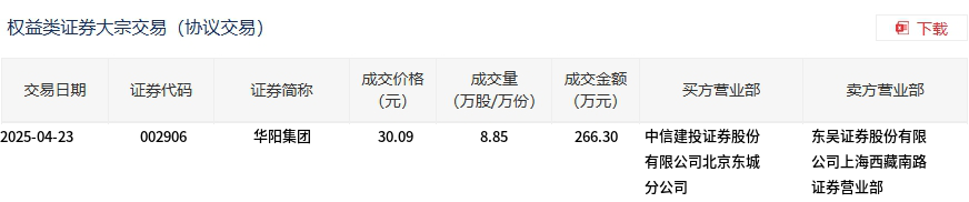 4月23日,华阳集团大宗交易成交8.85万股,成交额266.3万元,占当日总成交额的1.02%,成交价30.09元,较市场收盘价31.02元折价3%。