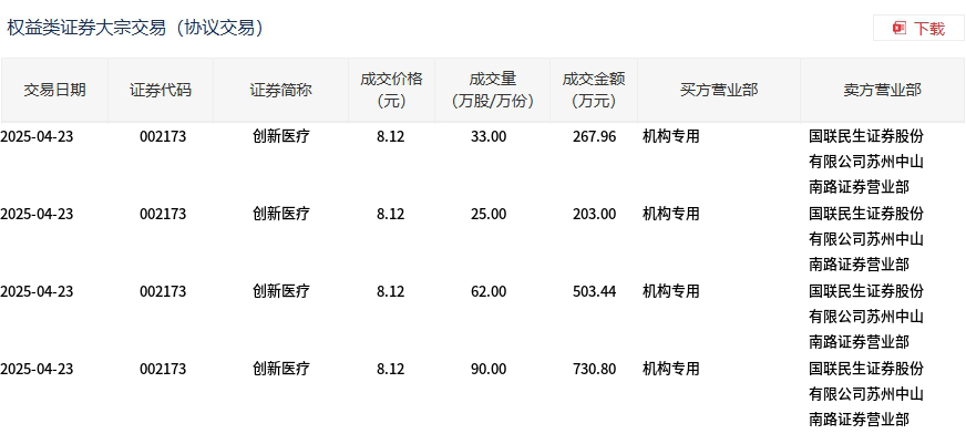 4月23日,创新医疗大宗交易成交210万股,成交额1705.2万元,占当日总成交额的8.49%,成交价8.12元,较市场收盘价9.08元折价10.57%。