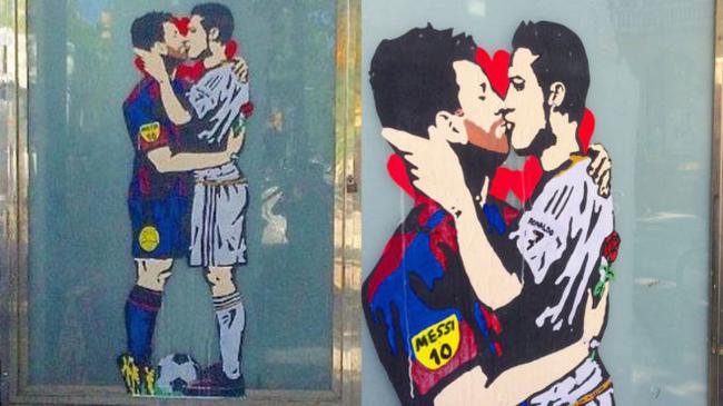 西班牙国家德比开战在即,在艺术之都巴塞罗那,这里的艺术家用一种独特的方式诠释着他们心中的世纪大战。只见巴塞罗那街头的一幅画作上,梅西踮着脚尖,手握玫瑰,与C罗拥抱接吻,C罗也深情地抱住了梅西的脖颈。这位充满了创意的艺术家,用这种方式表现了他对国家德比的理解:不是剑拔弩张和硝烟四起,而是一次爱意绵绵的拥吻。