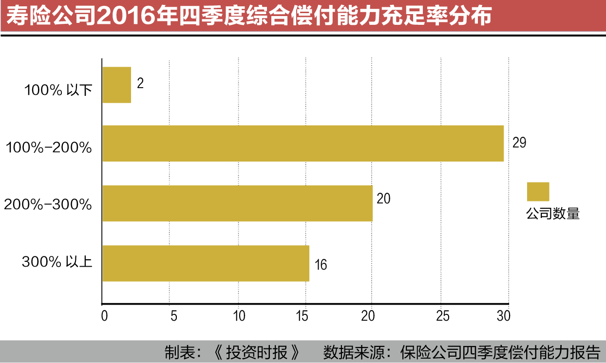 数据显示,67家已发布2016年第四季度偿付能力报告的寿险公司,其综合偿付能力充足率平均为242.32%,中位数为215%。综合偿付能力充足率超过300%的公司有16家,成立于2014年12月的渤海人寿以773.72%位居榜首,中华人寿以749.5%排名第二,华汇人寿以615.82%居于第三。