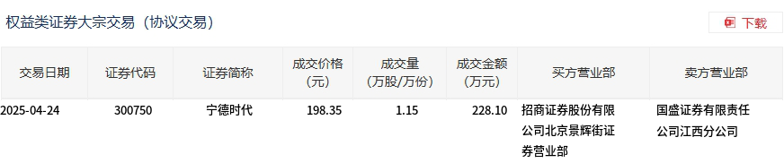 4月24日,宁德时代大宗交易成交1.15万股,成交额228.1万元,占当日总成交额的0.05%,成交价198.35元,较市场收盘价236.87元折价16.26%。