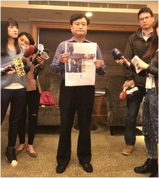 (总裁办顾问梁家尧(中)在4.12记者会)