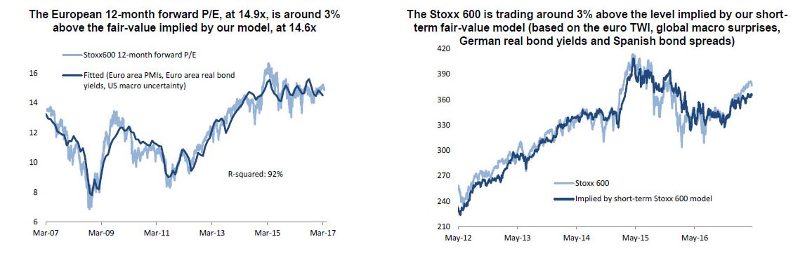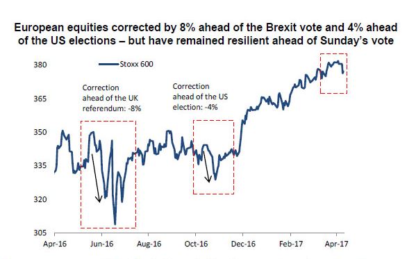 然而现在市场笃信马克龙和勒庞将进入第二轮大选,并最终由马克龙获胜,导致欧股市场在大选前颇不平常地保持镇静。不仅没有像英国退欧公投前那样下跌8%,或像去年美国大选前下跌4%,反而比德银模型的12个月市盈率水平(14.6x)高出2%(14.9x),接近年内新高。欧洲STOXX 600指数周五收涨0.02%报378.12点,也比德银模型高出3%(365点)。