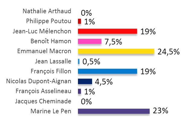 BVA民调结果显示,马克龙的支持率下降1个百分点至23%,勒庞的支持率持稳在23%,梅朗雄支持率上升0.5个百分点至19.5%,菲永稳定在19%。