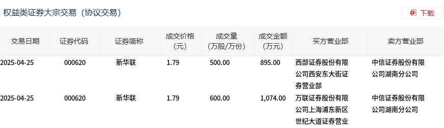 4月25日,新华联大宗交易成交1100万股,成交额1969万元,占当日总成交额的3.64%,成交价1.79元,较市场收盘价1.84元折价2.72%。
