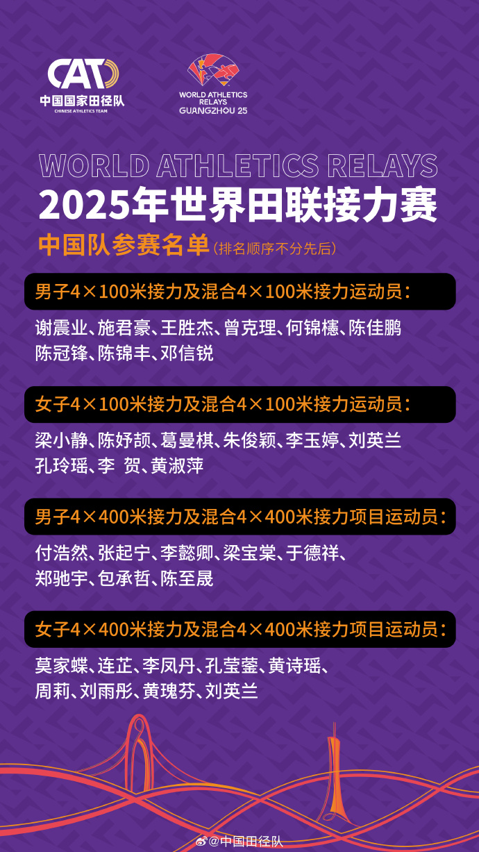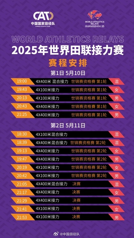 2025年世界田联接力赛将于5月10日—11日在广州天河体育中心进行,赛事设6个项目,各项排名前14的队伍将直接获得今年东京世锦赛的参赛资格,中国队将参与全部6项比赛。