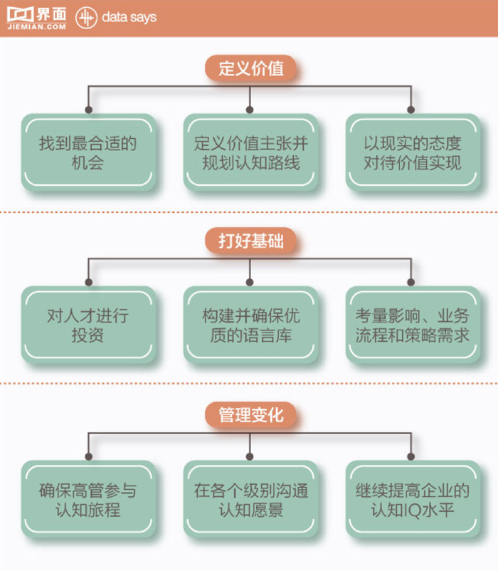 3.管理变化 :确保高管参与认知旅程——其中包括高管参与对增量式进度和价值实现的常规检查,在各个级别沟通认知愿景。