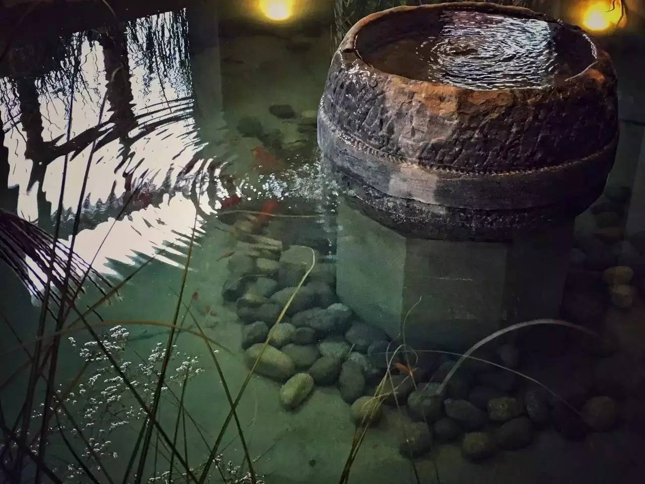 除周一休息外,空间每天下午两点半开始营业。采访时刚过晌午,推门进入山谷的家,左手边靠墙是一座长长的吧台,吧台一角放置着小娟与山谷里的居民的几张专辑;右手边整齐摆放着一些桌椅和不少高大的绿植,当中穿插着几根水泥柱,未经任何修饰; 厅中最惹眼的还要数一汪水池,水池不深,池底由鹅卵石铺就,其中还有几条悠游的金鱼。由于窗户设置在进门的一侧,空间深处的舞台和独立茶室自然隐匿在了昏暗的光线之中。一位临时看店的老人正拿着喷壶往水泥地洒水,此时除老人之外,整个空间再没有其他人。