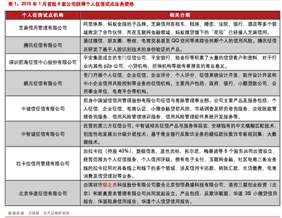 2015年1月,央行印发《关于做好个人征信业务准备工作的通知》,包括互联网公司、金融机构及民营公司在内的8家公司获得首批试点资格,明确准备时间为6个月。这八家机构为芝麻信用、腾讯征信、深圳前海征信、鹏元征信、中诚信征信、中智诚征信、拉卡拉信用、北京华道征信。