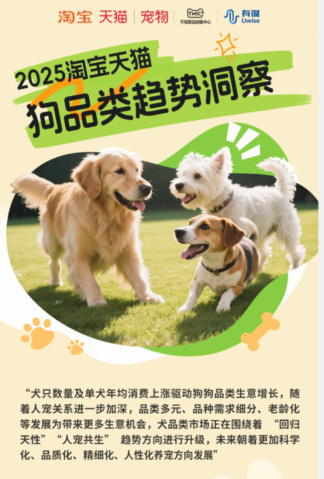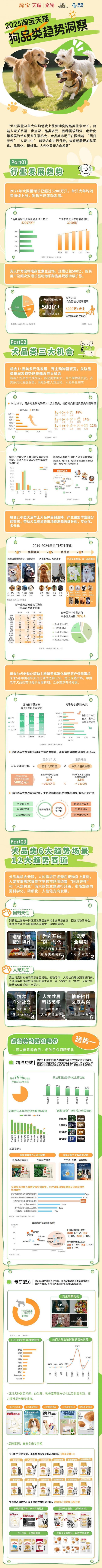 近日,淘宝天猫宠物发布《2025淘宝天猫狗品类趋势洞察》,联动皇家、网易严选、冠能、福来恩、爱肯拿、诚实一口、麦富迪、伯纳天纯、海洋之星、疯狂小狗、比乐、ziwi 、佩蒂13个宠物大牌,把握市场脉搏,洞悉行业发展,引领宠物品类新趋势。报告向大众传递与宠共生理念下的破局之道,细致解析犬品类的增长机会点,为宠物品牌拓宽新的营销思路。
