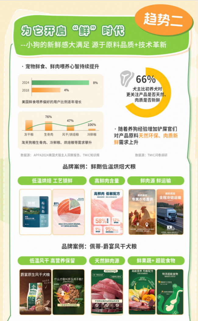 小狗的新鲜感大满足 源于原料品质+技术革新,宠物鲜食、鲜肉喂养心智持续提升。犬主比初养犬时更关注产品是否天然、肉质是否新鲜,冻干粮、生骨肉、风干/烘焙粮、冷鲜粮等需求攀升。