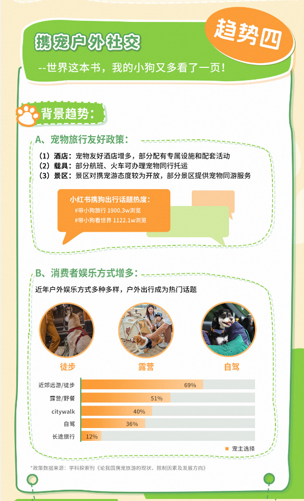 从消费侧观察,我们发现:宠物主对宠物的关注不再仅限于基本的饮食和日常护理,更延伸至情感陪伴等深层次需求。将宠物作为家庭核心成员的年轻人,一边降低着自己的恩格尔系数,一边给自家宠物安排上各种新鲜美食和健康好物,每一个细微之处,都彰显着对宠物的“用心程度”。越来越多的宠物主更期待与宠物共度旅行时光,宠物所带来的不仅是陪伴,更多的是即时的情绪价值、充满确定性的反馈。和宠物一起出游,不仅与“抱树恢复能量”、“公园20分钟效应” “在山野躺平”等带来同样的松弛治愈感,带小狗奔赴户外尽情撒欢,也能够让人们更好的回归自我,感受自由。