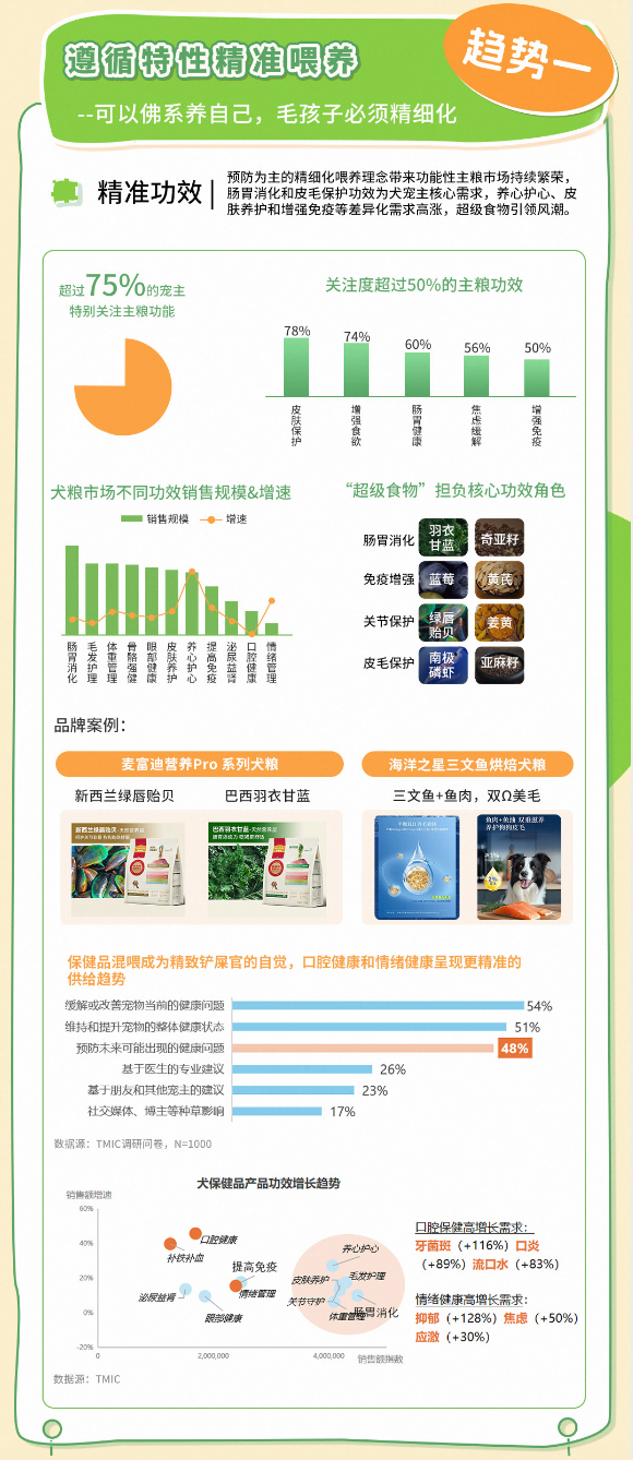 超过75%的宠主特别关注主粮功能,其中预防为主的精细化喂养理念,带来功能性主粮市场持续繁荣,肠胃消化和皮毛保护功效为犬宠主核心需求,养心护心、皮肤养护和增强免疫等差异化需求高涨,超级食物引领风潮。