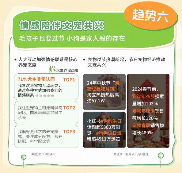 在此不难看出,宠物主们不仅对狗狗的身体和生命照顾周全,同时情感联系以及陪伴属性越发强烈。71%犬主非常认同,人犬互动加强情感联系是核心养宠态度。宠物过节热潮新起,#宠物也要吃月饼 淘宝热搜热度高达57.2W,宠物年夜饭一度将销售额提升增长超过120%。