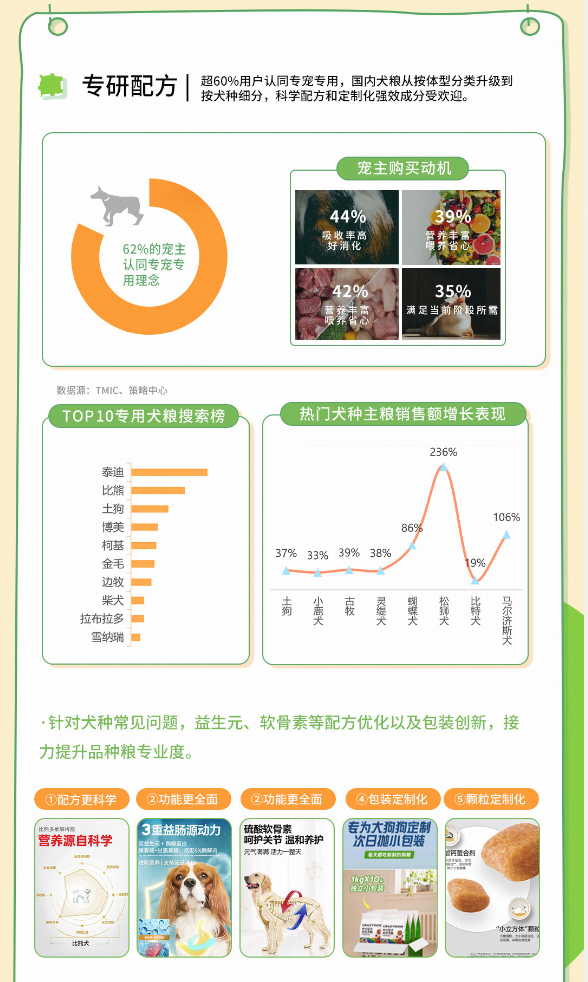 另外超60%用户认同专研配方专宠专用,国内犬粮从按体型分类升级,按犬种细分,科学配方和定制化强效成分受欢迎。