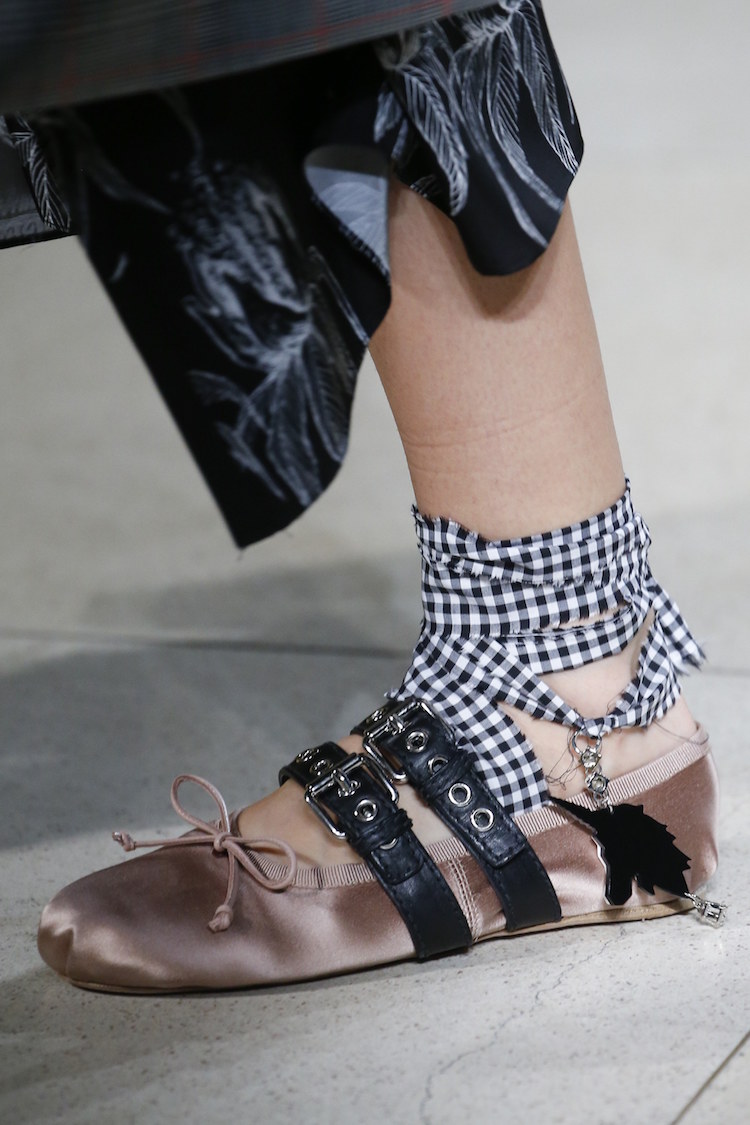 尽管蝴蝶结平底鞋也不是这两年才流行起来的,但最近一轮回春大火应该是源于Miu Miu 2016春夏系列中的芭蕾舞鞋——在获得了不错的反响之后,Miu Miu趁热打铁于2016秋冬系列,继续推出了一系列不同色系的芭蕾舞鞋。