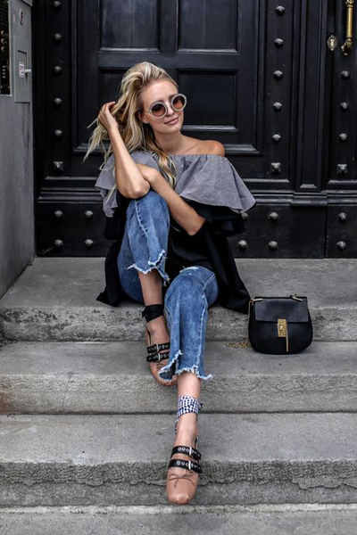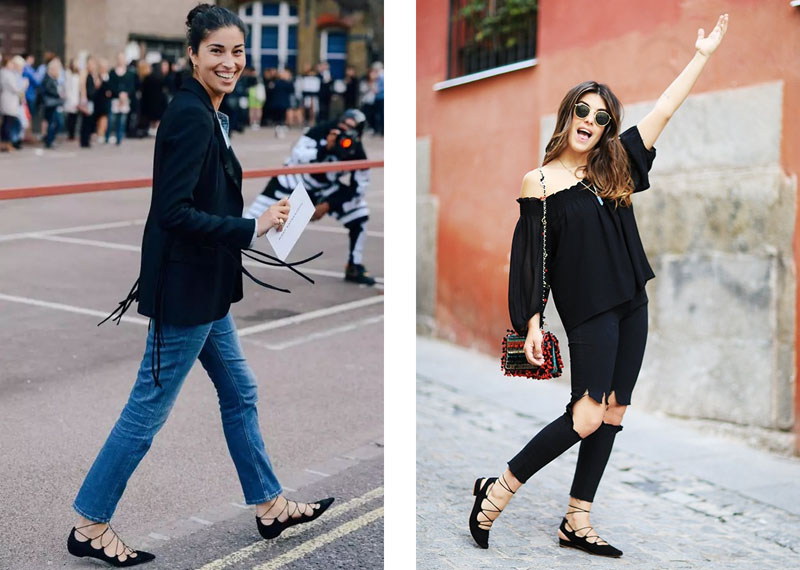像是博主Chiara Ferragni就用蝴蝶结绑带鞋和牛仔裤搭在一起穿出休闲感。