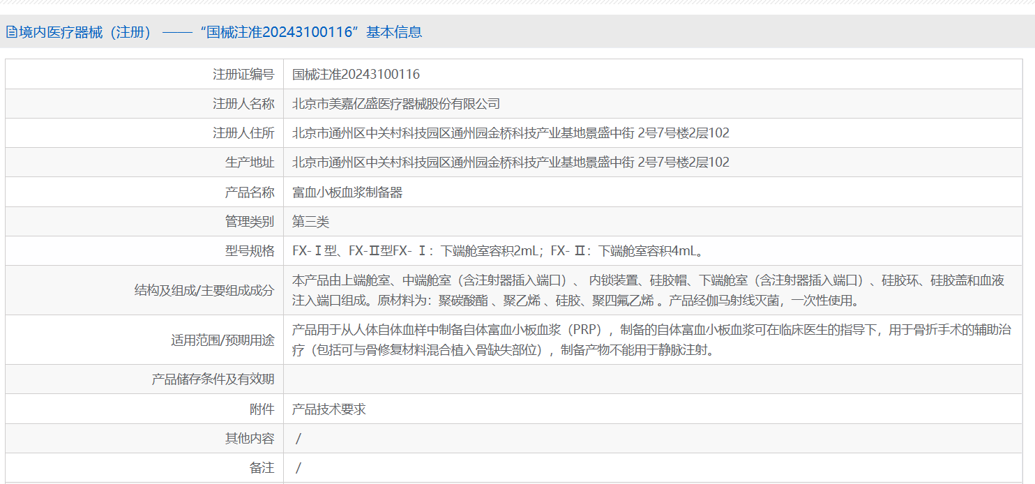 产品用于从人体自体血样中制备自体富血小板血浆(PRP),制备的自体富血小板血浆可在临床医生的指导下,用于骨折手术的辅助治疗(包括可与骨修复材料混合植入骨缺失部位),制备产物不能用于丽芙莎 静脉注射。