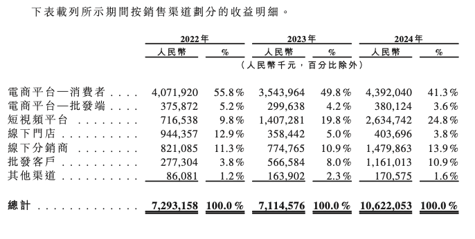 2022年-2024年,公司来自短视频平台的收入分别为7.17亿元、14.07亿元、26.35亿元,营收占比也一路攀升,分别为9.8%、19.8%、24.8%。而传统电商平台渠道收入虽获得增长,但占比不断下滑,报告期内公司电商平台—消费者收入占比分别为55.8%、49.8%、41.3%。