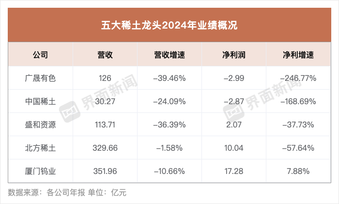 据界面不完全统计,中国稀土(000831.SZ)、北方稀土(600111.SH)、盛和资源(600392.SH)、厦门钨业(600549.SH)、广晟有色(600259.SH)这五家头部稀土企业中,只有厦门钨业实现净利增长,其余四家公司均出现显著下降。
