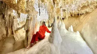 网络视频中,一名女子赤脚涉入洞穴内一汪乳白色晶花池,池底铺满透明穴珠与钙膜晶锥,池壁生长着形似珊瑚、葡萄的沉积物。