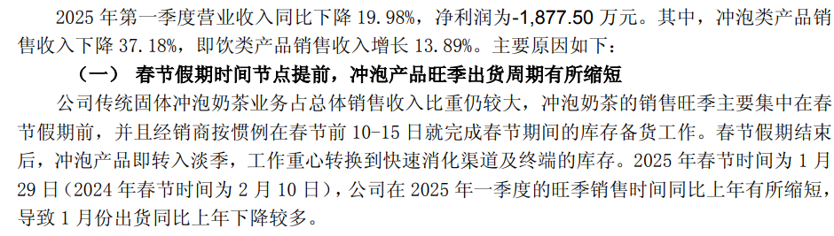 处于冬天的第一季度和第四季度通常是冲泡奶茶的销售旺季,然而年报显示,2024年香飘飘只有第一季度营收出现了同比增长,其他三季度均为同比下滑的状态。今年一季度,香飘飘冲泡产品收入再次同比下滑37.18%;香飘飘对此表示,主要源于今年春节假期时间节点提前,冲泡产品旺季出货周期有所缩短。