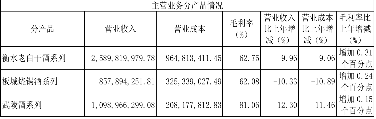 根据财报资料,该公司100元以上产品主要代表有1915衡水老白干酒、十八酒坊(甲等20)、武陵上酱等;100元以下产品有十八酒坊(8酒)、十八酒坊(王牌酒)、武陵飘香等。