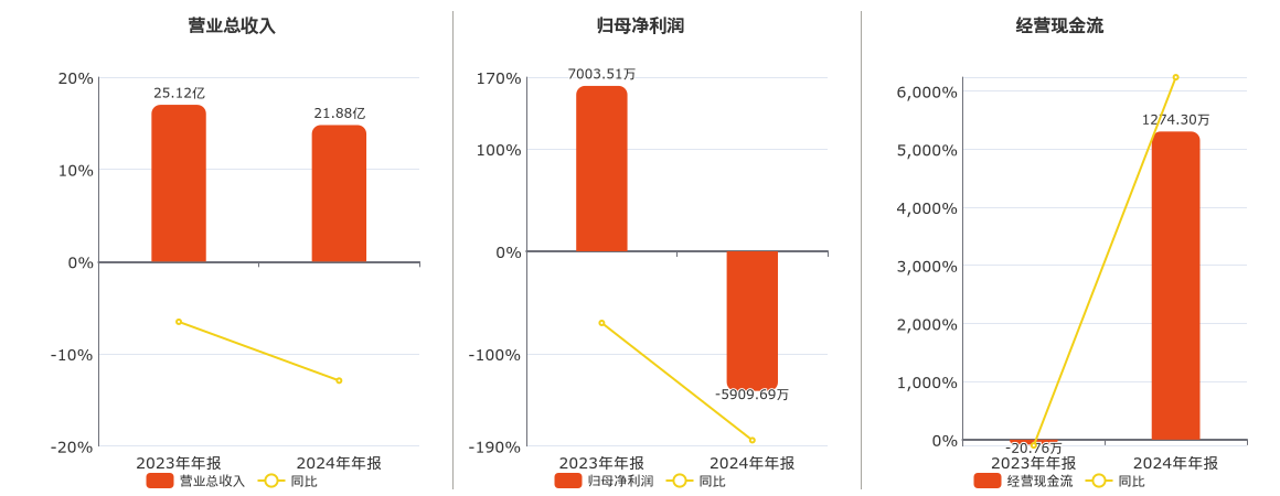 公司营业总收入为21.88亿元,在已披露的同业公司中排名第19,较去年同报告期营业总收入减少3.24亿元,同比较去年同期下降12.91%。归母净利润为-5909.69万元,在已披露的同业公司中排名第28,较去年同报告期归母净利润减少1.29亿元,同比较去年同期下降184.38%。经营活动现金净流入为1274.30万元,在已披露的同业公司中排名第28,较去年同报告期经营活动现金净流入增加1295.06万元。