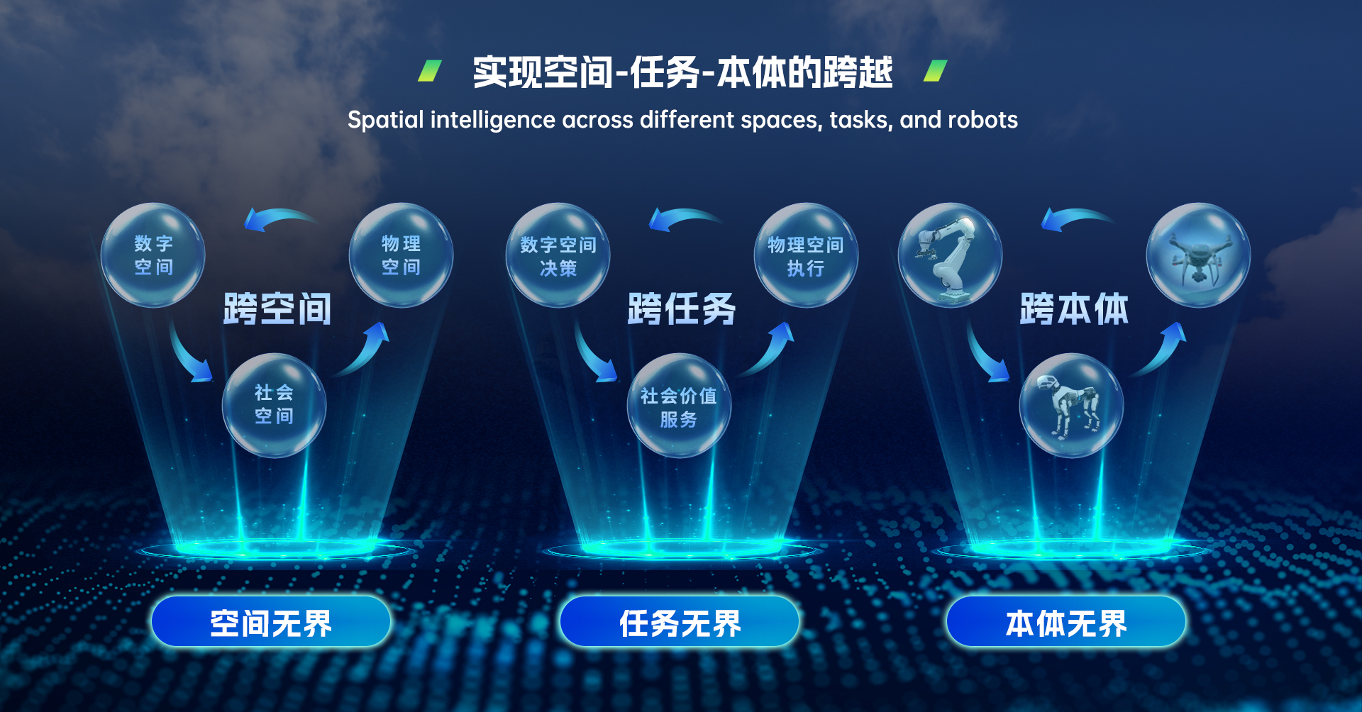 为何能“无界”?悠然无界大模型之所以能“无界”,在于其打破了空间、任务与本体的固有边界:它能够同时感知和理解数字空间、物理空间与社会空间,实现空间上的无缝联通;具备跨模态的泛化能力和通用性,支持感知、决策、控制等多种任务的统一处理,实现泛化任务的通用适配;同时,它具备强大的抽象与迁移能力,能够跨越不同智能体与系统架构之间的差异,实现本体上的协同与共享。三重维度的融合突破,使悠然无界大模型成为构建空间智能的核心基础。