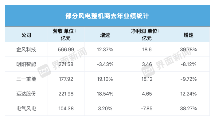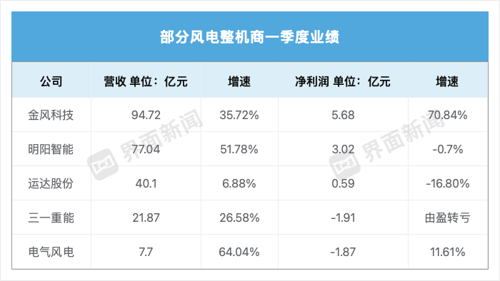 同为头部企业的金风科技、明阳智能(601615.SH)、运达股份(300772.SZ)等,均在一季度维持了盈利状态,金风净利润更是同比增长70.84%,达到5.68亿元。