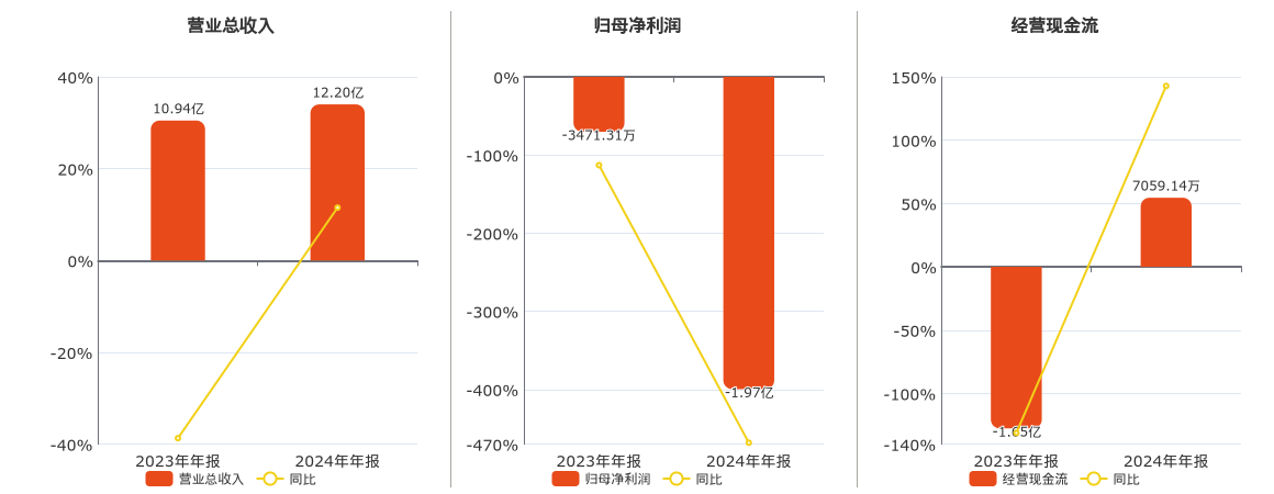 公司营业总收入为12.20亿元。归母净利润为-1.97亿元,在已披露的同业公司中排名第130,较去年同报告期归母净利润减少1.63亿元。经营活动现金净流入为7059.14万元,在已披露的同业公司中排名第87。