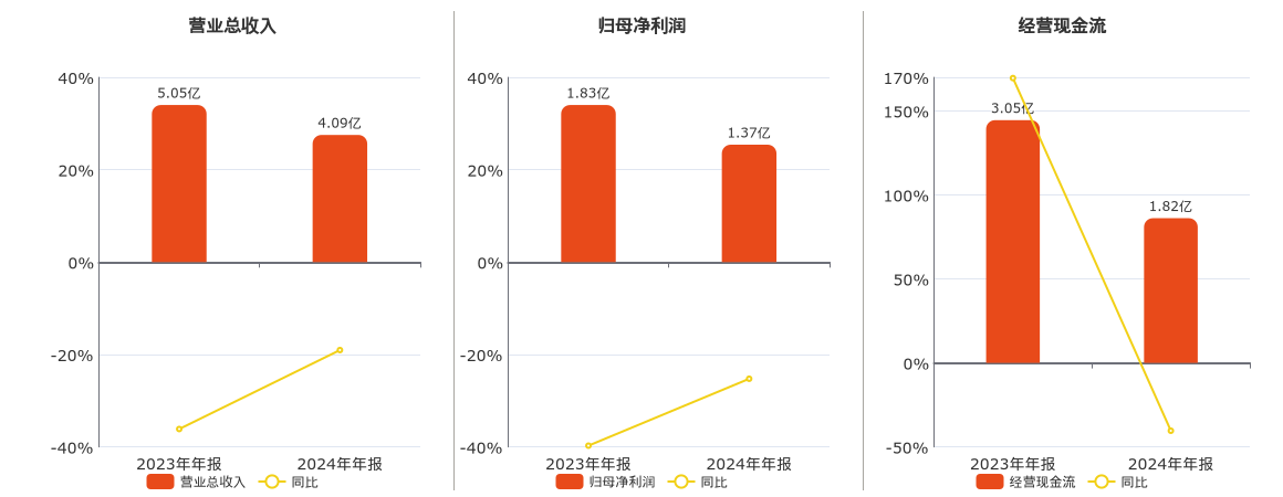 公司营业总收入为4.09亿元,在已披露的同业公司中排名第84,较去年同报告期营业总收入减少9620.34万元,同比较去年同期下降19.04%。归母净利润为1.37亿元,较去年同报告期归母净利润减少4621.73万元,同比较去年同期下降25.25%。经营活动现金净流入为1.82亿元,较去年同报告期经营活动现金净流入减少1.23亿元,同比较去年同期下降40.39%。