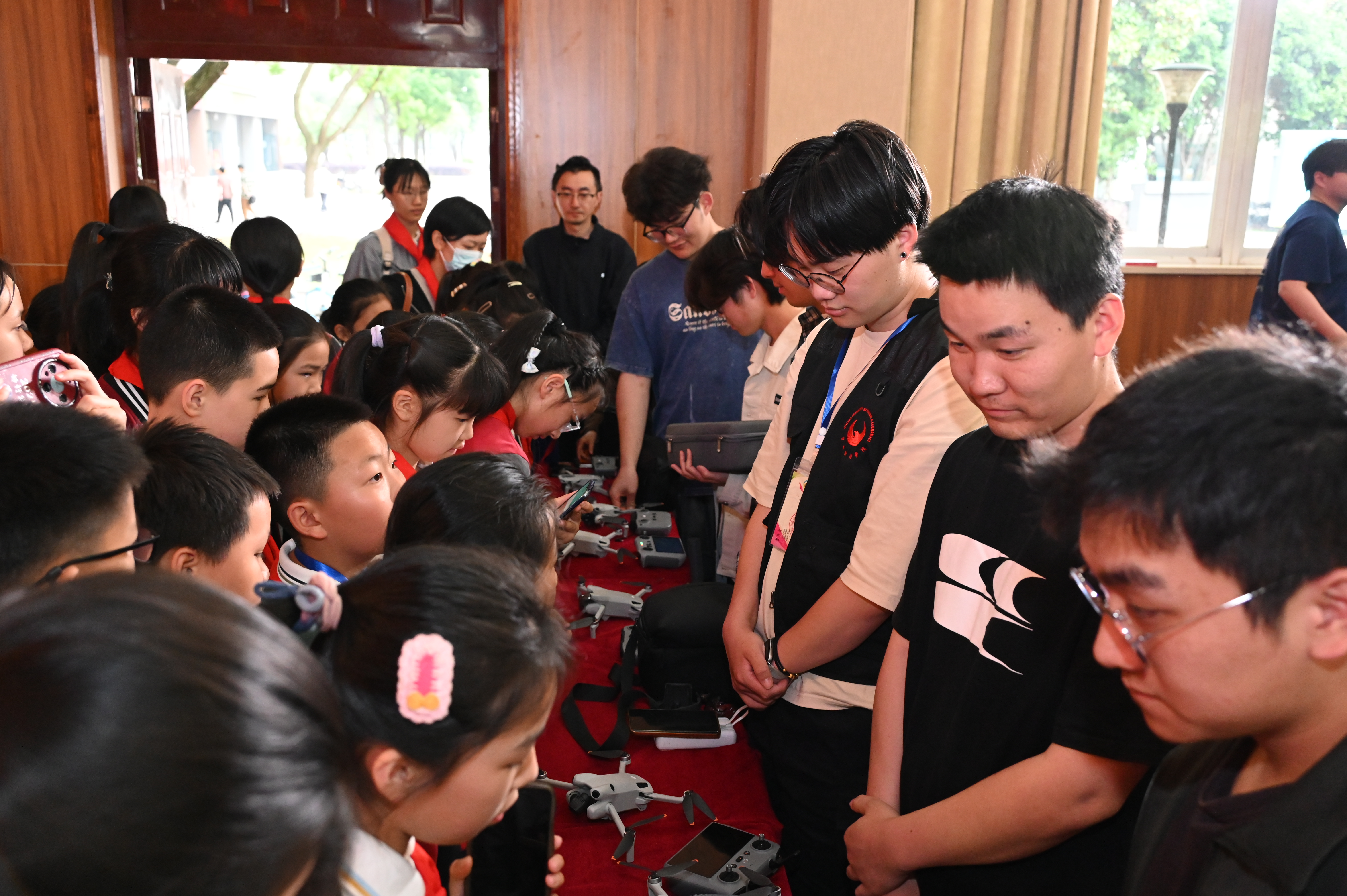“来,同学们,我们一起看向远方!”在宁财院航拍协会指导教师王伟用诙谐风趣的语言为大家讲解航拍知识,并招呼大家摆好Pose,运用升腾而起的无人机定格了大小学生牵手共进的美好瞬间。