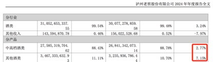 不过,2024年,中高档酒类的营收同比增速为2.77%,其他酒类营收同比增速为7.15%,对比2023年二者皆有所下滑。去年同期,中高档酒类和其他酒类的同比营业收入增长均超过20%。